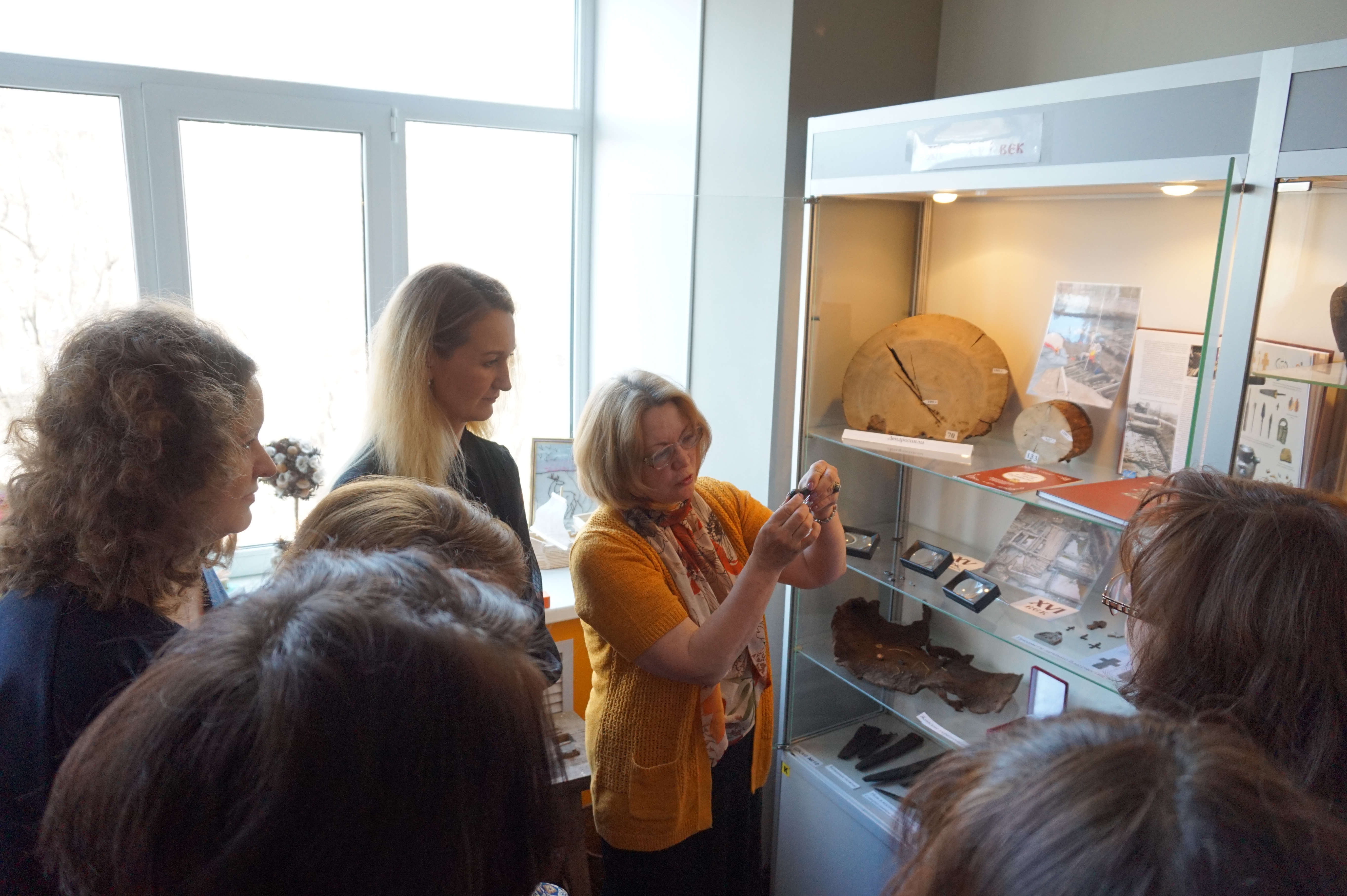 В течение месяца на выставке уже побывали вологодские школьники, педагоги, археологи. А сегодня автор выставки – методист АОУ ДО ВО «Региональный центр дополнительного образования детей» Лариса Сергеевна Андрианова провела экскурсию для коллег - сотрудников Регионального центра, познакомив с тайнами вологодской земли и рассказав об особенностях сохранности органических материалов в условиях Вологды и об интересных и уникальных археологических находках.