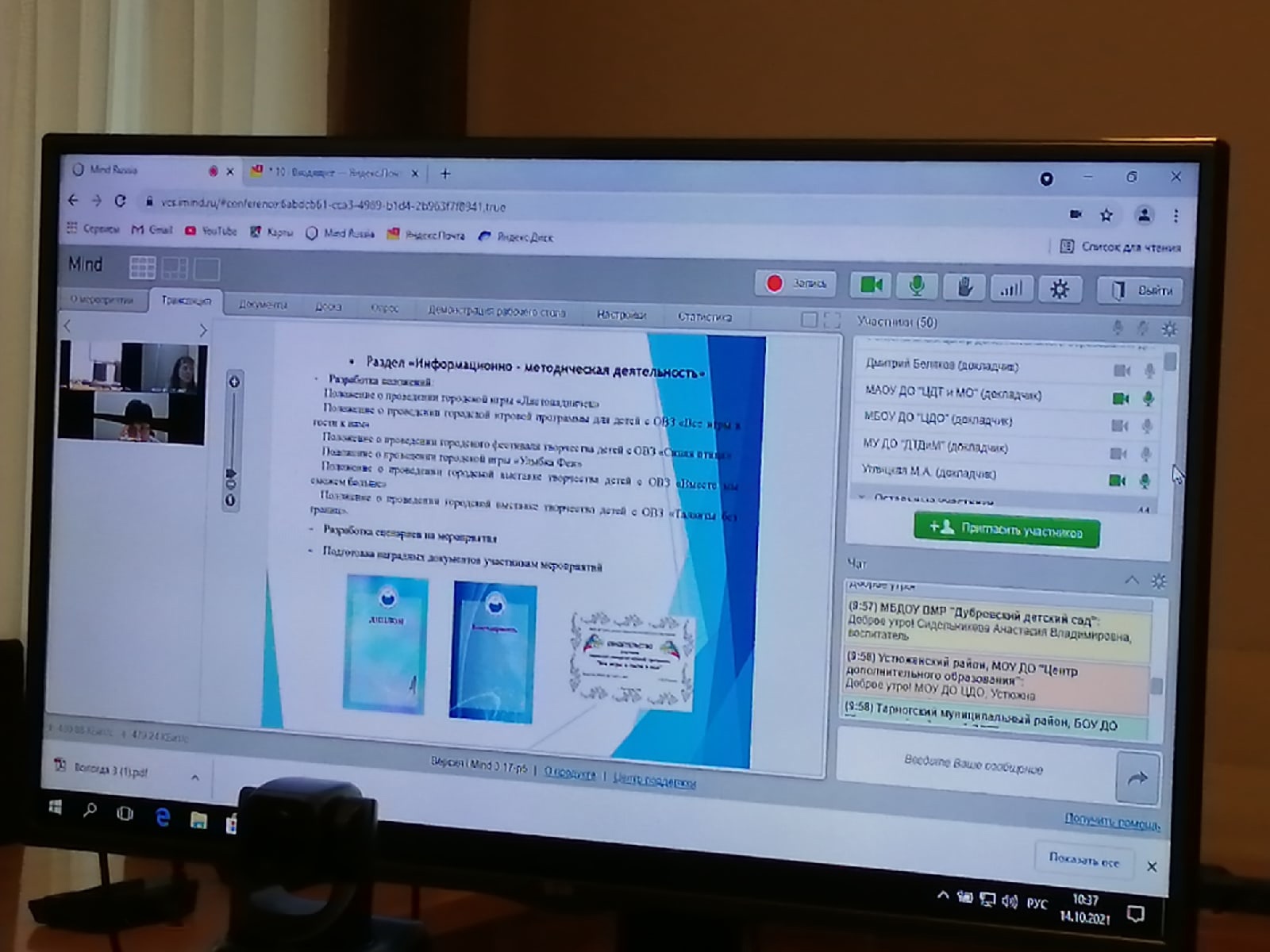 С приветственным словом к участникам вебинара обратились старший методист регионального центра Ирина Васильевна Шишебарова и Маргарита Альбертовна Углицкая, заведующий кафедрой социализации и воспитания Вологодского института развития образования. На вебинаре презентован сборник материалов из опыта работы по организации дополнительного образования детей с ограниченными возможностями здоровья, в котором представлены практики дополнительного образования Центра детского творчества и методического обеспечения (г. Череповец), Центра дополнительного образования (г. Великий Устюг) и Дворца творчества детей и молодежи (г. Вологда). Педагоги, чьи материалы вошли в сборник, и представившие данные практики на вебинаре, стали победителями областного конкурса на лучшую организацию дополнительного образования детей с ограниченными возможностями здоровья в образовательной организации, проведенного в первой половине 2021 года, в номинации "Система дополнительного образования детей с ограниченными возможностями здоровья в образовательной организации".