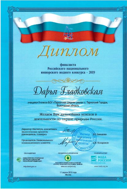 Участие в Российском национальном юниорском водном конкурсе в 2019 году от Вологодской области приняла работа Дарьи Гладковской, обучающейся 9 класса Тарногской средней школы, выполненная под научным руководством Надежды Петровны Каториной (учитель биологии), Ольги Валентиновны Ежовой (учителя географии) и Людмилы Александровны Зыковой (учителя химии). Проект называется «Комплексное исследование озера Бобровое».