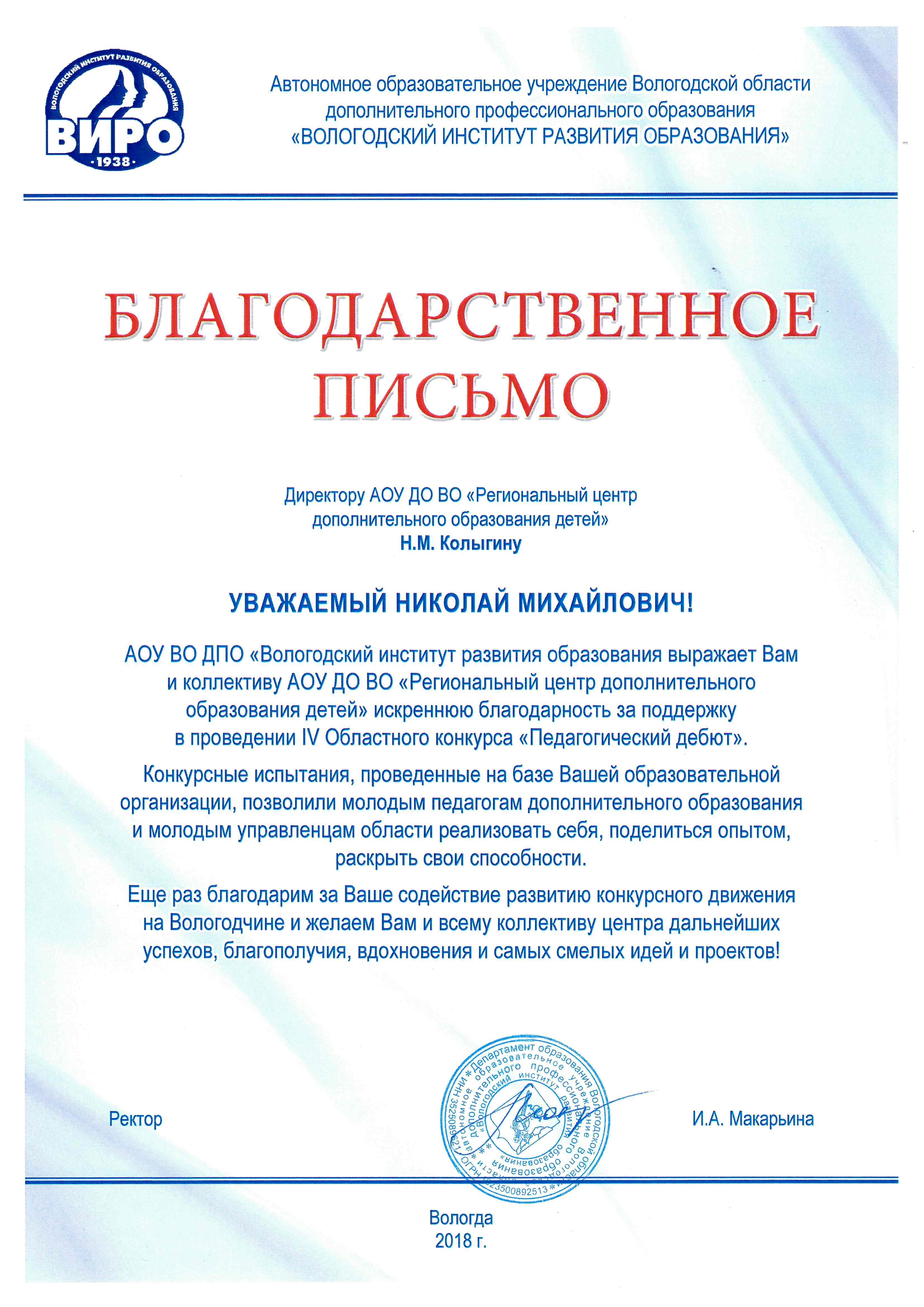 На имя Николая Михайловича Колыгина, директора АОУ ДО ВО «Региональный центр дополнительного образования детей», поступило Благодарственное письмо за подписью Ирины Альбертовны Макарьиной, ректора АОУ ВО ДПО «Вологодский институт развития образования».