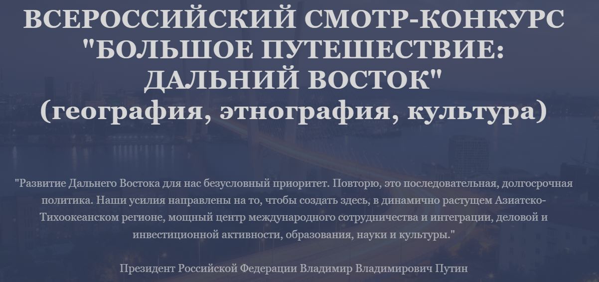 ОБратите внимание! С 21 ноября 2024 года по 8 апреля 2025 года проводится Всероссийский конкурс «Большое путешествие по стране: Дальний Восток (география, этнография, культура)». К участию в конкурсе приглашаются молодые граждане в возрасте от 10 до 21 года, заинтересованные в изучении и развитии Дальнего Востока.