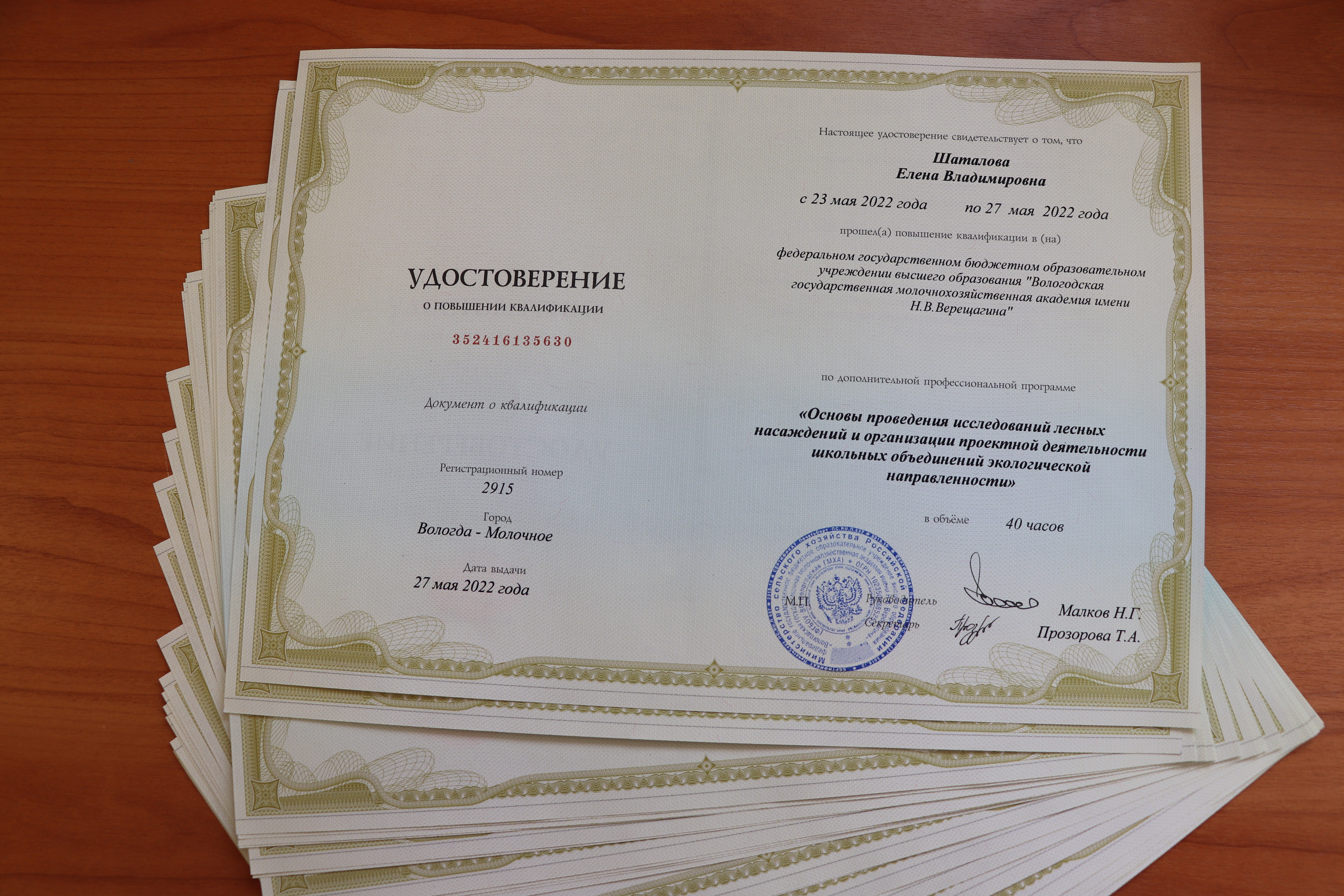 Завершилось обучение по дополнительной профессиональной программе «Основы проведения исследований лесных насаждений и организации проектной деятельности школьных объединений экологической направленности» (40 часов), которое проходило с 23 по 27 мая 2022 года на базе факультета повышения квалификации и переподготовки Вологодской ГМХА имени Н. В. Верещагина. Занятия проводили преподаватели факультета агрономии и лесного хозяйства Вологодской ГМХА имени Н. В. Верещагина.